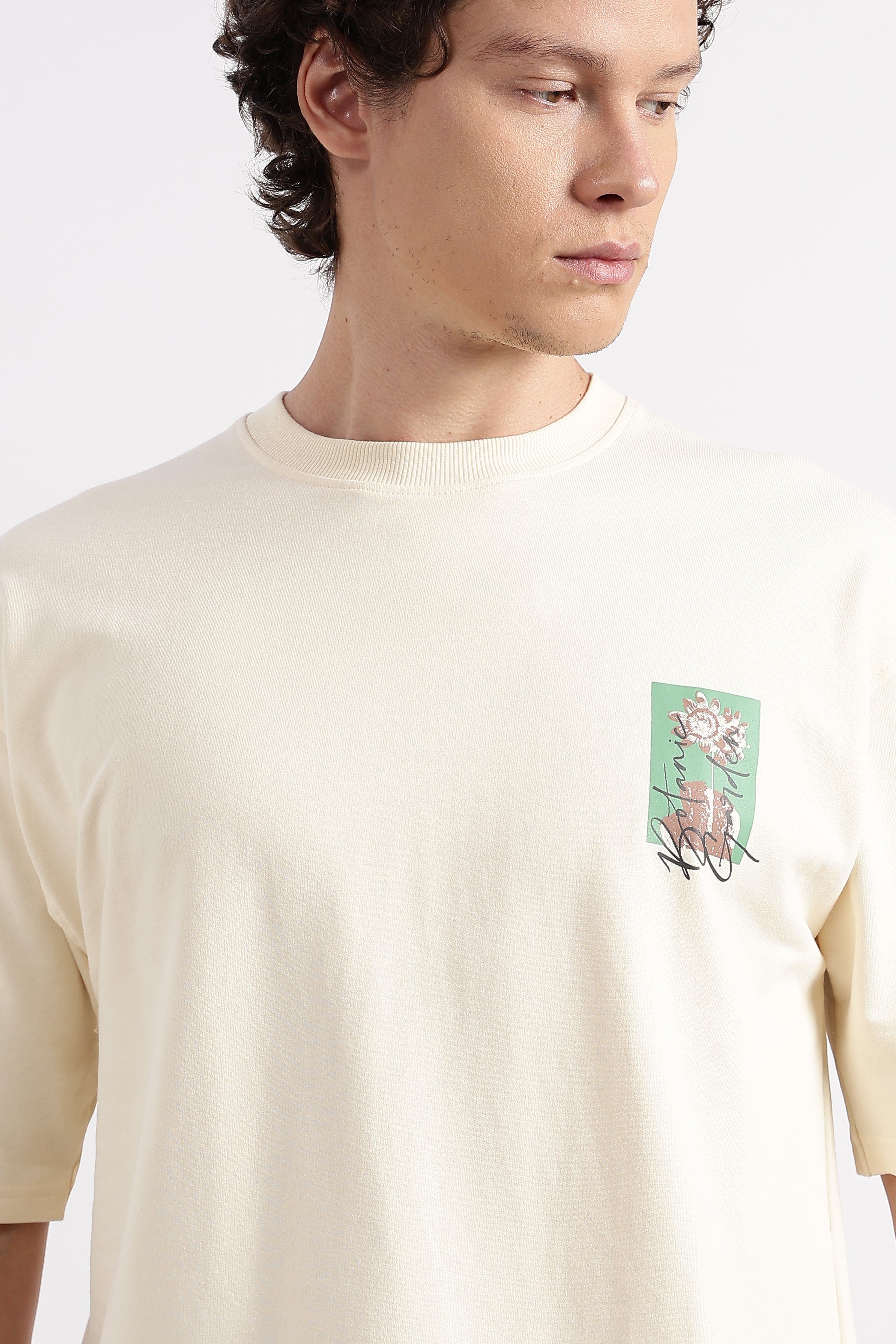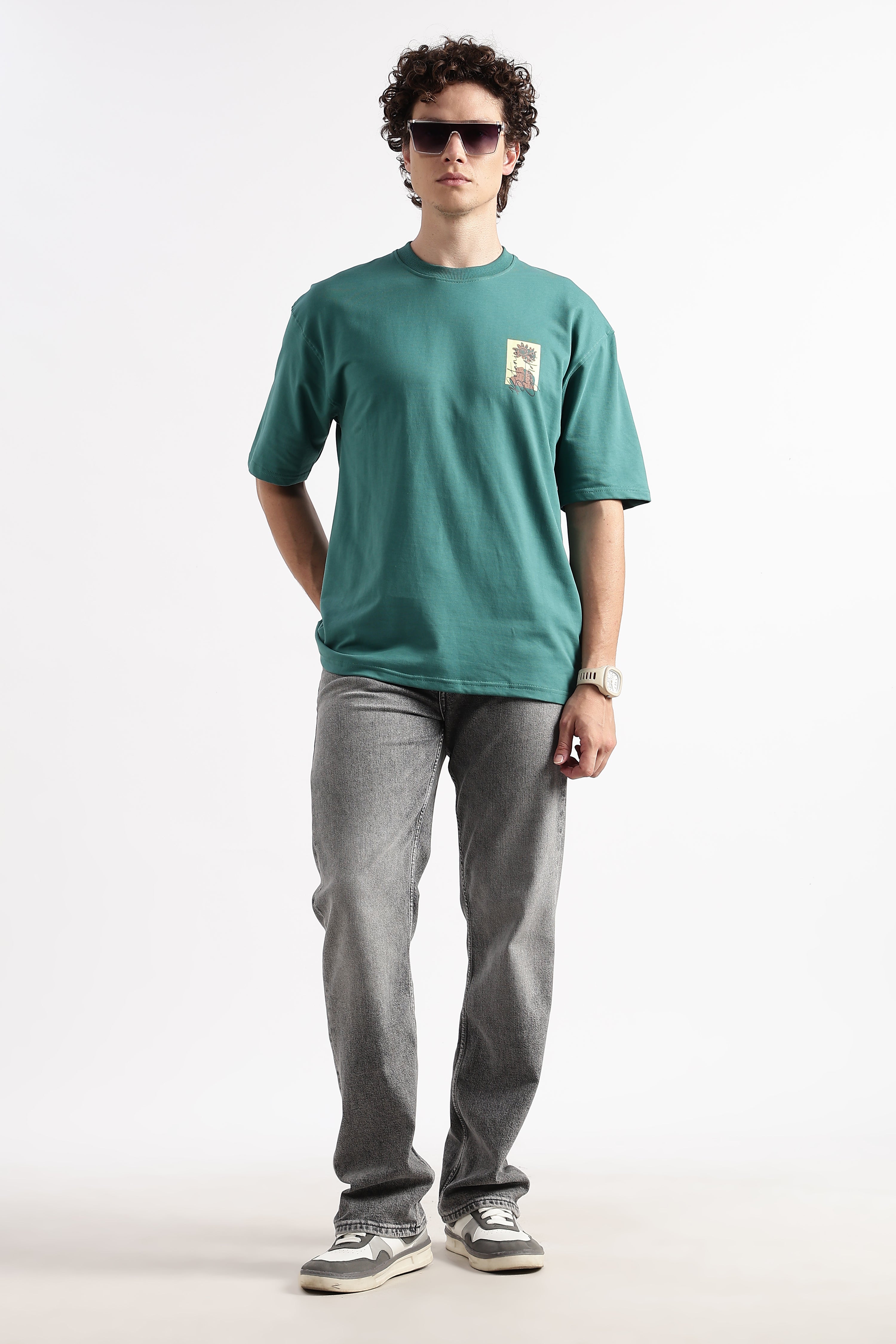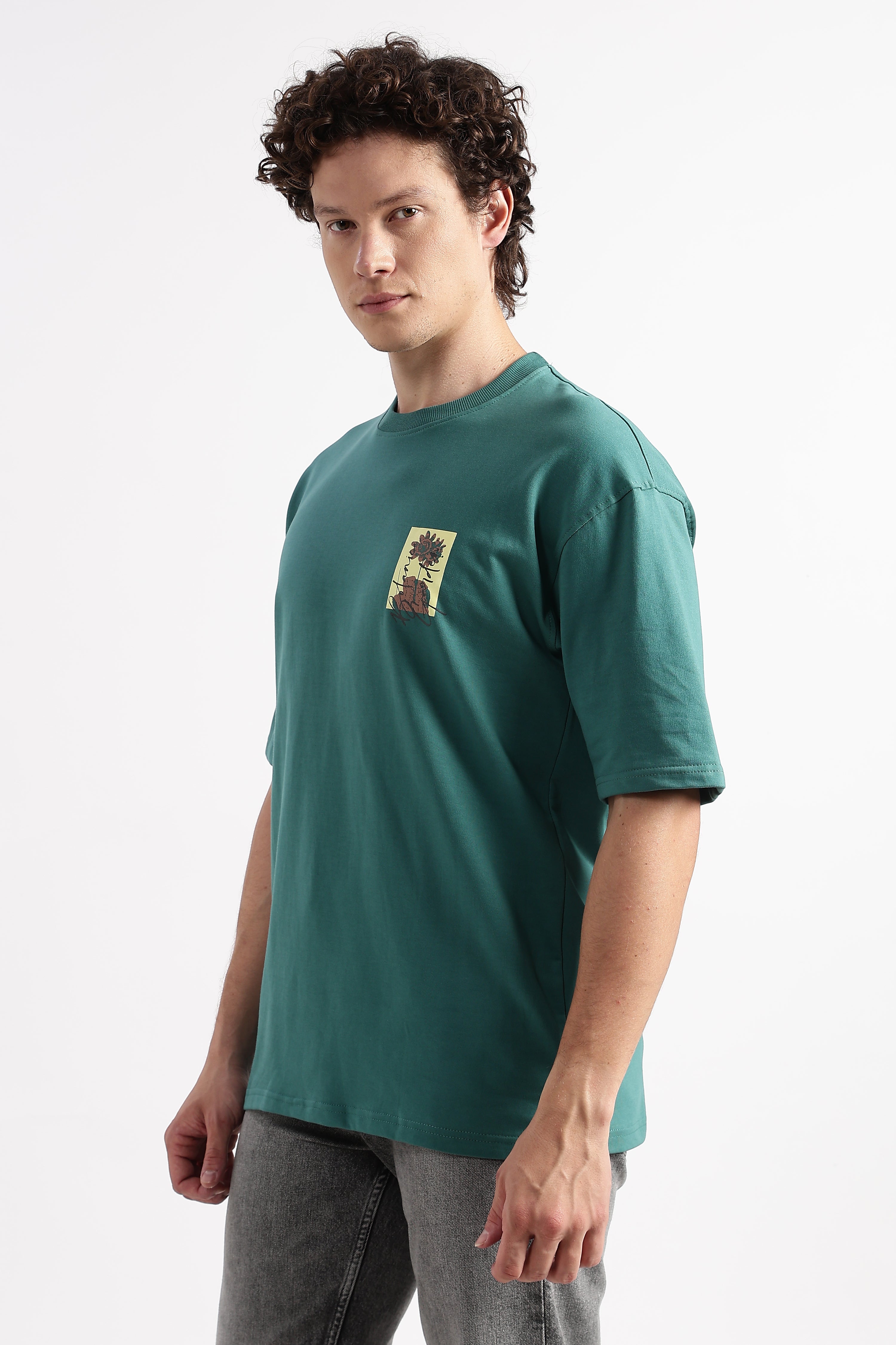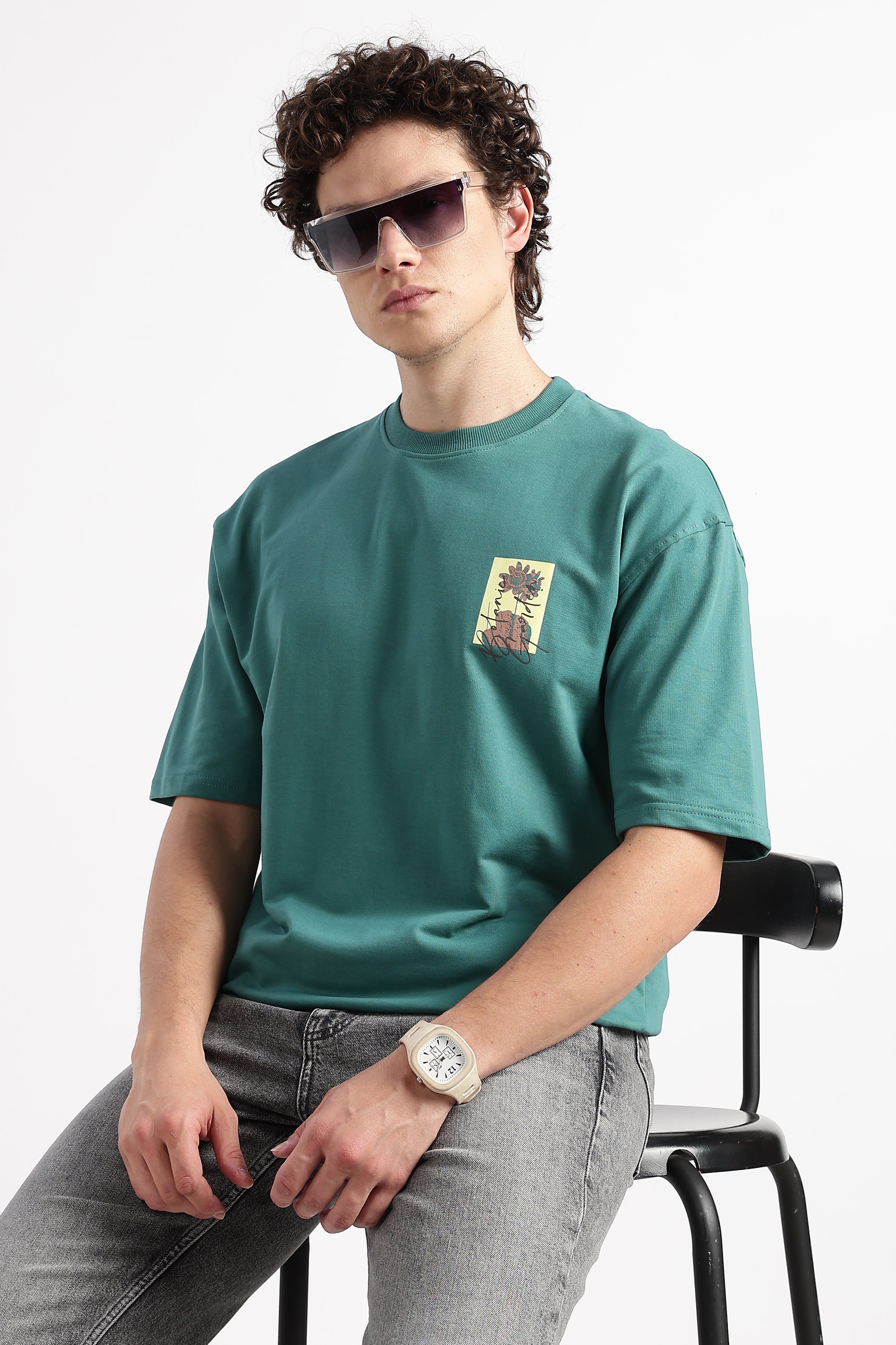 A Dark Green, oversized men's t-shirt featuring a subtle front graphic and a large, artistic floral and script graphic print on the back, perfect for a casual, modern streetwear aesthetic