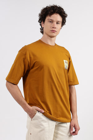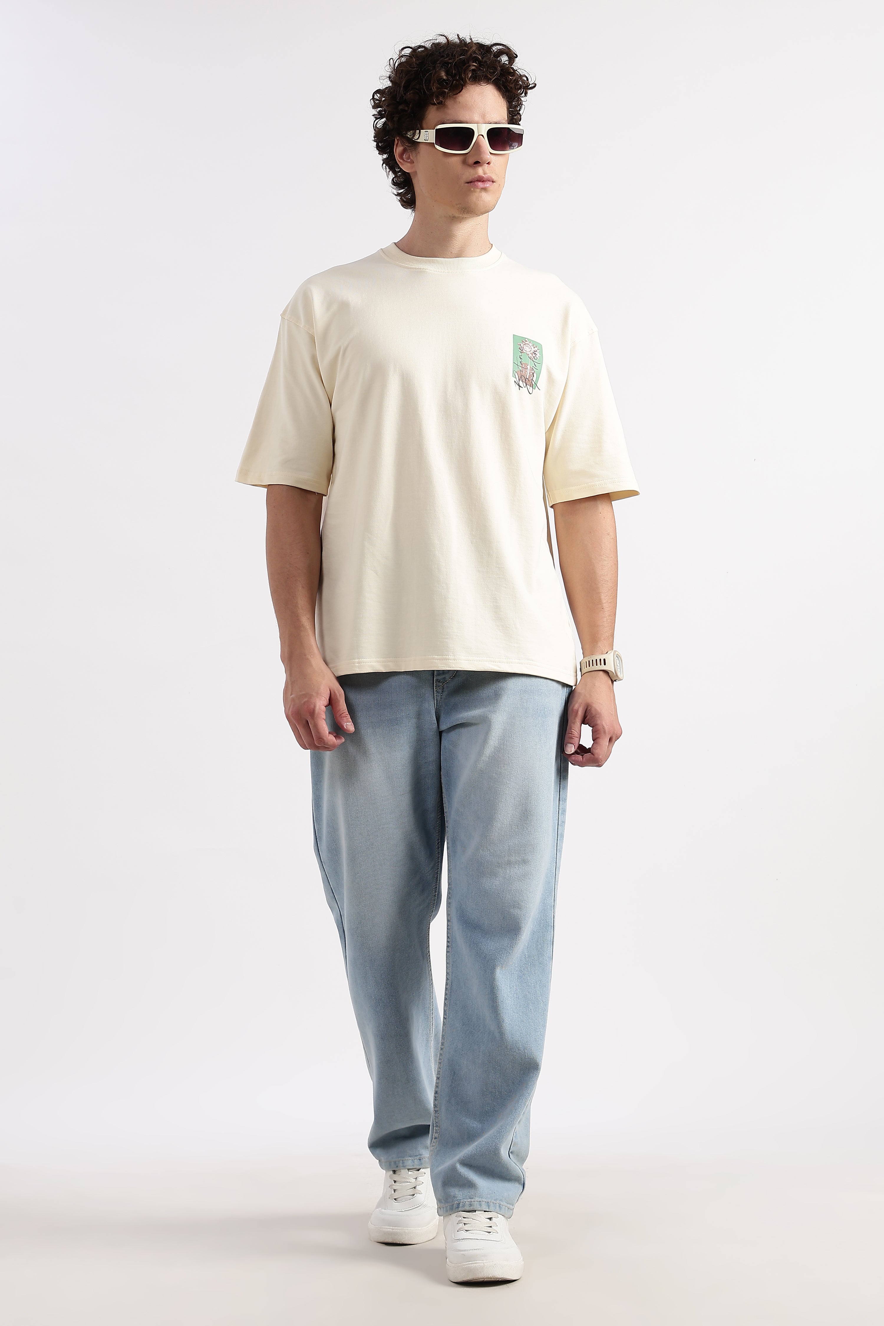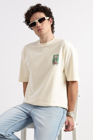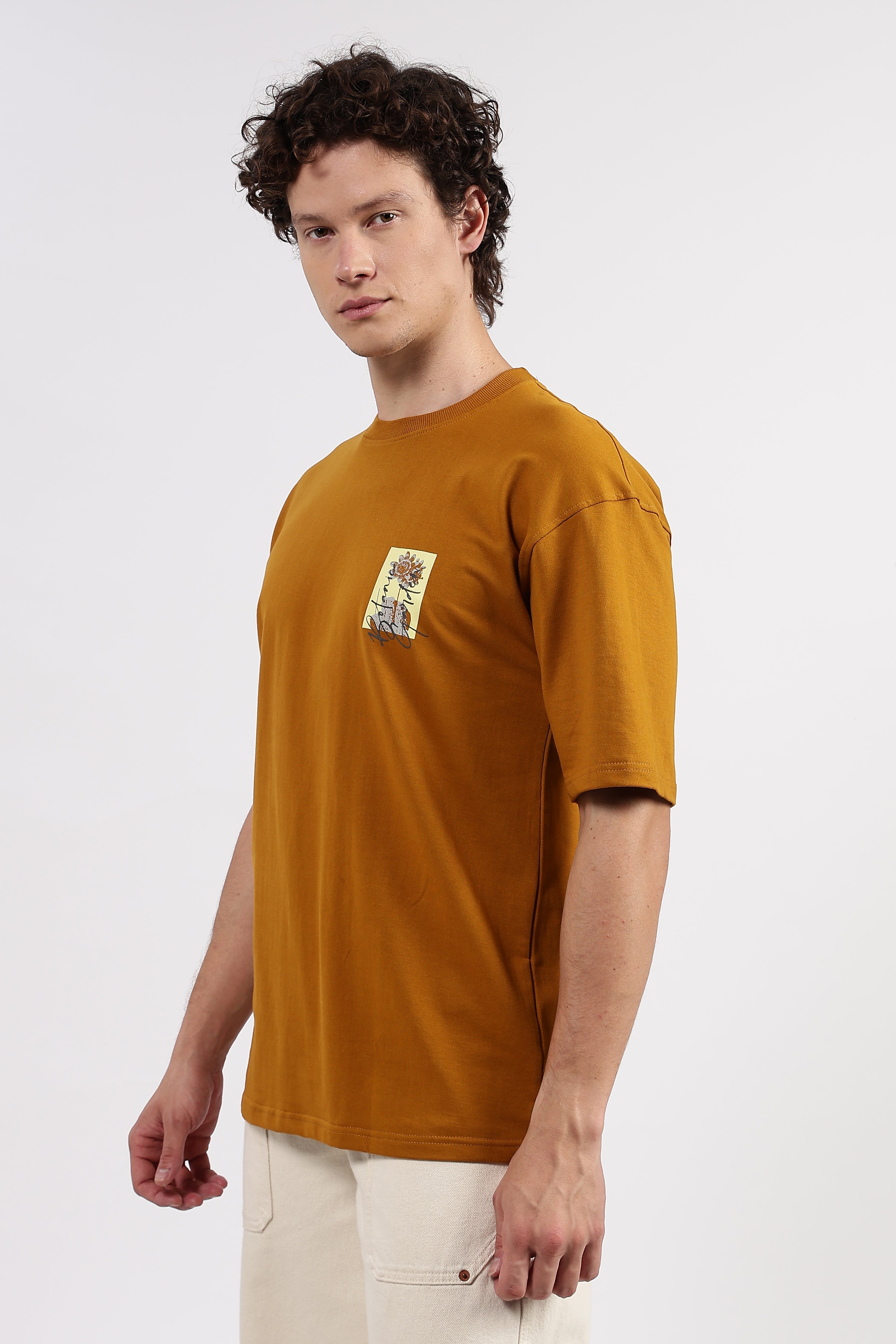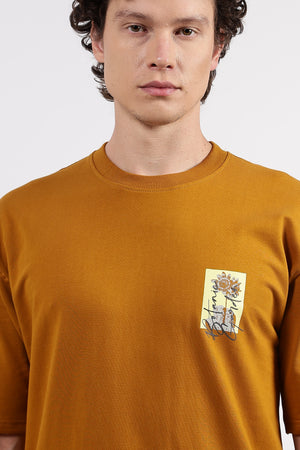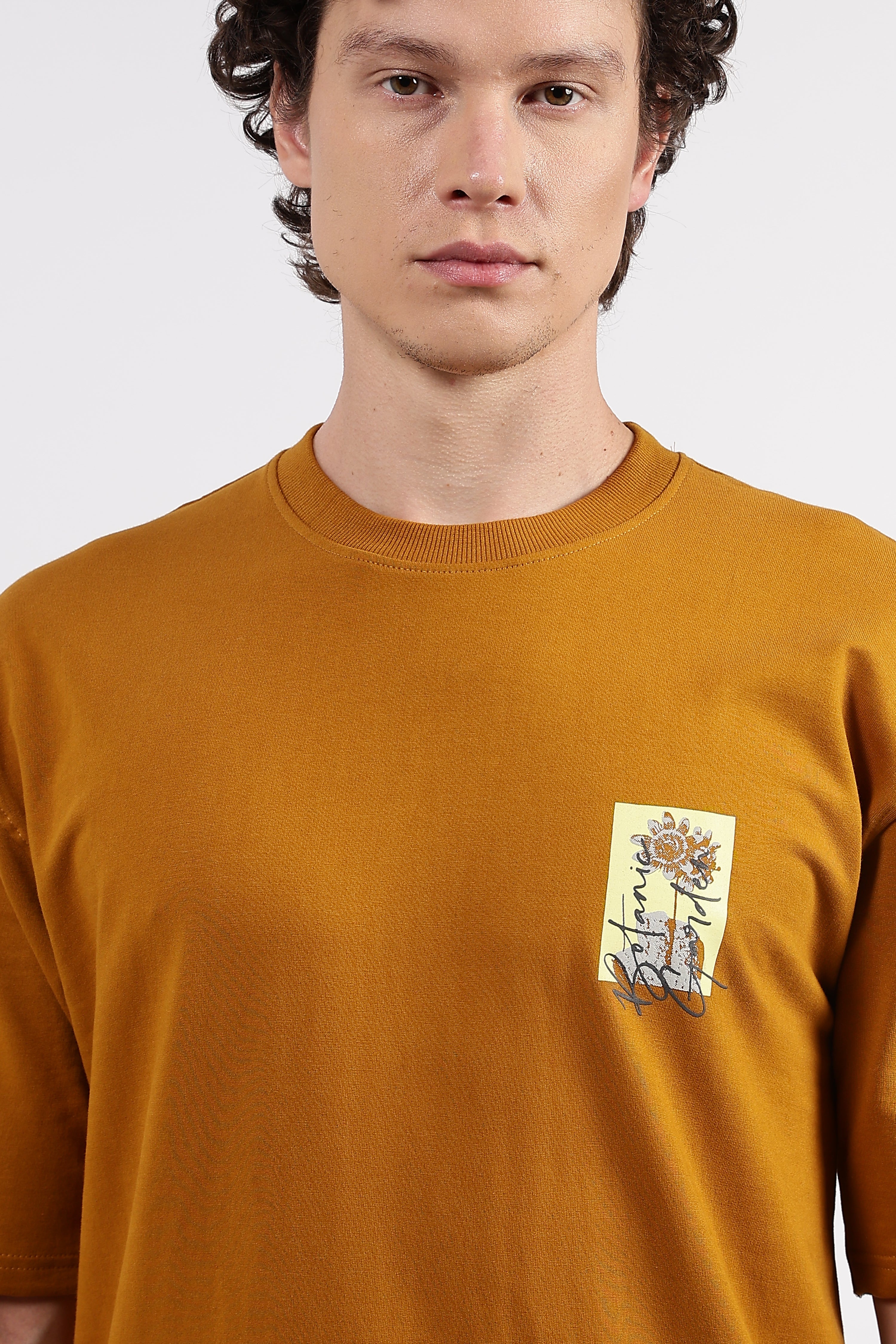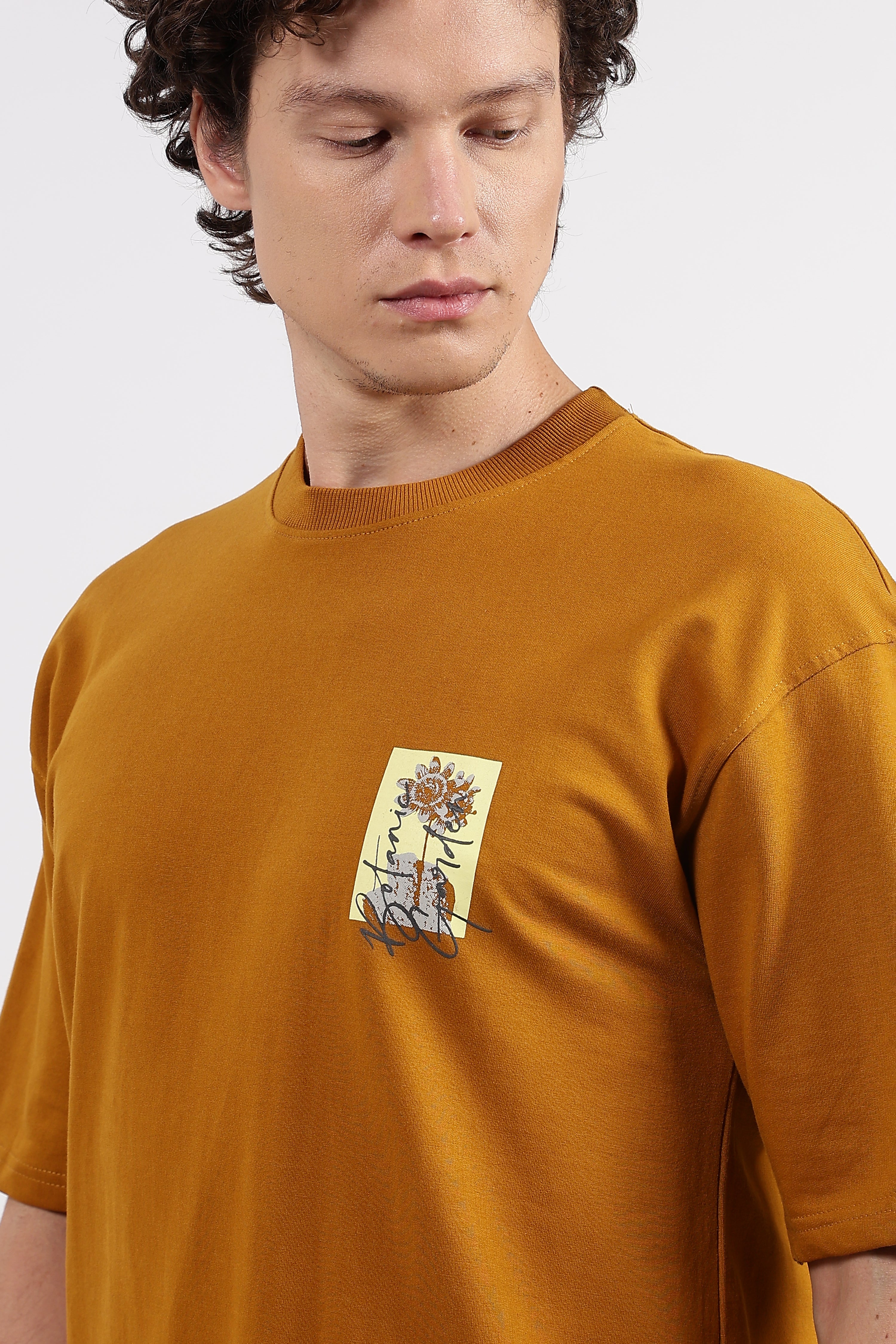 A Dark Green, oversized men's t-shirt featuring a subtle front graphic and a large, artistic floral and script graphic print on the back, perfect for a casual, modern streetwear aesthetic