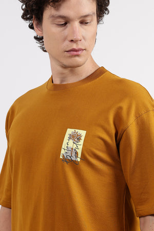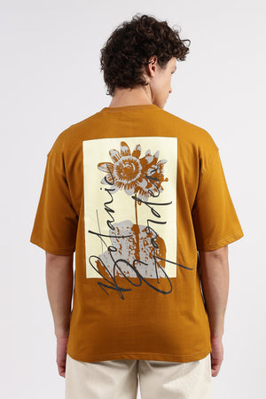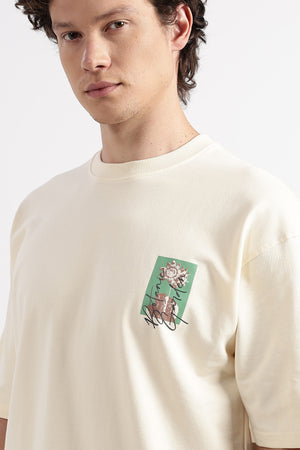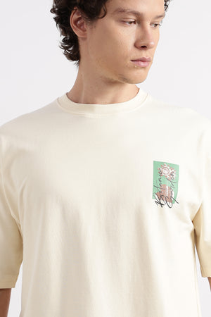 A Beige, oversized men's t-shirt featuring a subtle front graphic and a large, artistic floral and script graphic print on the back, perfect for a casual, modern streetwear aesthetic